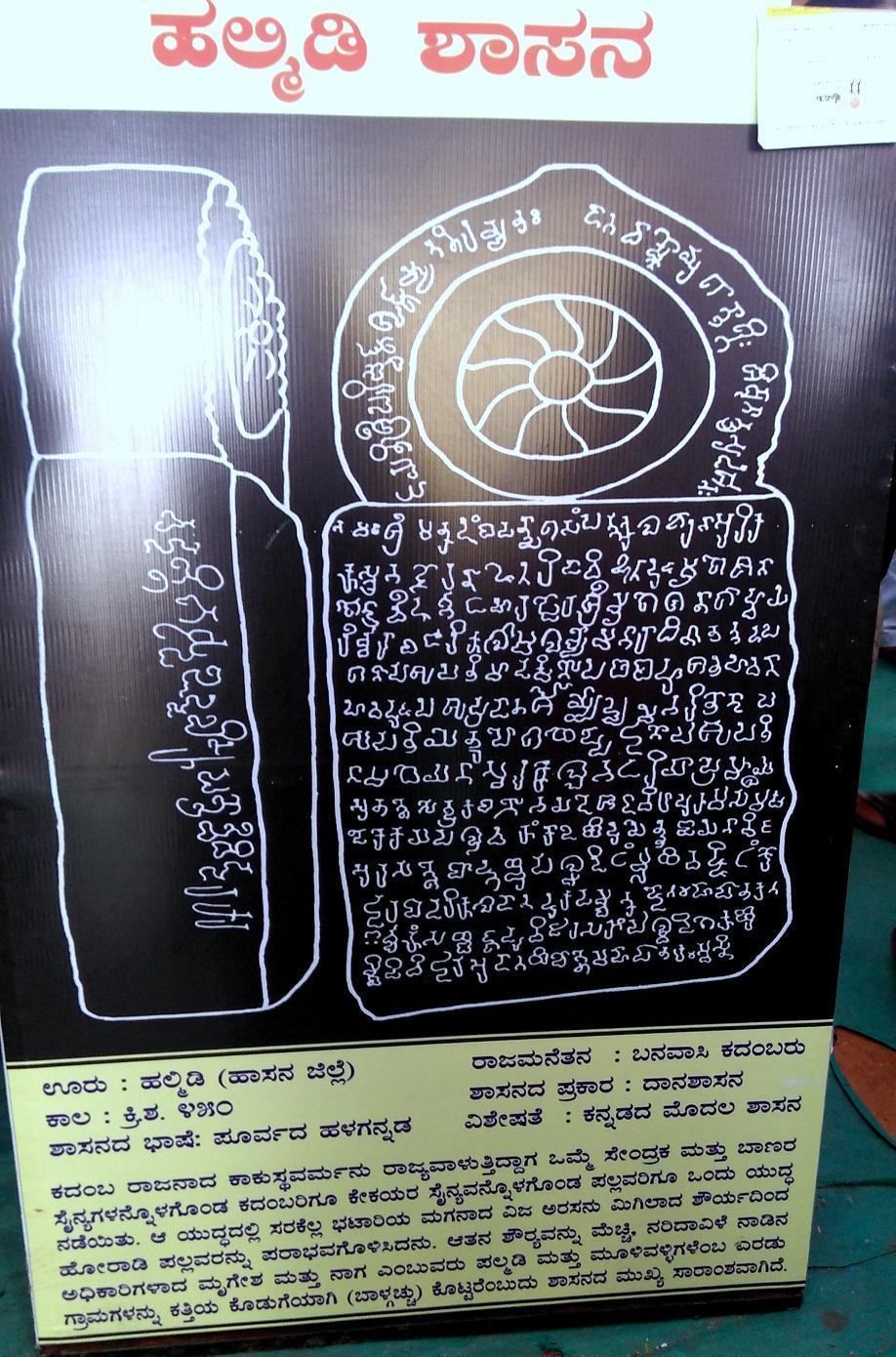 ಕನ್ನಡದ ಪ್ರಥಮ ಶಾಸನವೆಂದು ಗುರುತಿಸಲಾದ ‘ಹಲ್ಮಿಡಿ ಶಾಸನ’ದ ಬಗ್ಗೆ ಮಾಹಿತಿ.ಮೈಸೂರಿನ ಸಾಹಿತ್ಯ ಸಮ್ಮೇಳನದಲ್ಲಿ ಪುಸ್ತಕಮಳಿಗೆಯೊಂದರ ಮುಂದೆ ಕಂಡ ಫಲಕ .