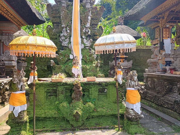 ಹಾಗಾದರೆ , ಮುಂದಕ್ಕೆ ಹೋಗೋಣ ಎಂದು ಅಲ್ಲಿಂದ 3 ಕಿಮೀ ದೂರದಲ್ಲಿದ್ದ ‘ ತೀರ್ಥ ಎಂಪುಲ್’ ಗೆ ಭೇಟಿ ಕೊಡುವುದೆಂದು ನಿರ್ಧಾರವಾಯಿತು. ‘ವಿಷ್ಣು’ವಿನ ಮಂದಿರವಿರುವ ಈ ಸ್ಥಳವು ಬಾಲಿನೀಸ್ ಮತ್ತು ಪ್ರವಾಸಿಗರನ್ನು ಆಕರ್ಷಿಸುವ ಪ್ರಮುಖ ಸಾಂಸ್ಕೃತಿಕ ಮತ್ತು ಆಧ್ಯಾತ್ಮಿಕ ಕ್ಷೇತ್ರವಾಗಿದೆ. ತೀರ್ಥ ಎಂಪುಲ್ ನ ಪ್ರವೇಶ ದ್ವಾರದಲ್ಲಿ, ನಮಗೆ ಸೊಂಟಕ್ಕೆ ಕಟ್ಟಿಕೊಳ್ಳಲು ‘ಸಾಶ್’ ಎಂಬ ಬಟ್ಟೆ ಕೊಟ್ಟರು. ಸೀರೆಯುಟ್ಟವರಿಗೆ ಇದರಿಂದ ವಿನಾಯಿತಿ ಇತ್ತು. ಸೀರೆಗಿರುವ ಅಂತರಾಷ್ಟ್ರೀಯ ಗೌರವ ಮತ್ತೊಮ್ಮೆ ಸಾಬೀತಾಯಿತು. ಹಸಿರಿನ ಪರಿಸರದಲ್ಲಿದ್ದ ಮರಗಳು, ಕೊಳಗಳು, ಅಲ್ಲಲ್ಲಿ ಈಜುತ್ತಿದ್ದ ಬಣ್ಣಬಣ್ಣದ ದೊಡ್ಡ ಮೀನುಗಳು ಇವನ್ನೆಲ್ಲಾ ನೋಡುತ್ತಾ ಮುದ್ದಣನ ವಿವರಣೆಗೆ ಕಿವಿಗೊಡುತ್ತಾ ನಡೆದೆವು. ತೀರ್ಥ ಎಂಪುಲ್ ಎಂಬುದು ಬಾಲಿಯ ಟಂಪಕ್ಸಿರಿಂಗ್ನಲ್ಲಿ, 10 ನೇ ಶತಮಾನದಲ್ಲಿ ಆಡಳಿತ ನಡೆಸಿದ ವಾರ್ಮದೇವ ರಾಜವಂಶದ ಕಾಲದಲ್ಲಿ , ನಿರ್ಮಿತವಾದ ಪವಿತ್ರ ದೇವಾಲಯವಾಗಿದೆ. ಇಲ್ಲಿಯ ಉಕ್ಕುವ ನೀರಿನ ಬುಗ್ಗೆಯು ಪ್ರಬಲವಾದ ಆಧ್ಯಾತ್ಮಿಕ ಗುಣಗಳನ್ನು ಹೊಂದಿದೆ ಎಂದು ನಂಬುತ್ತಾರೆ. ಪವಿತ್ರ ನೀರಿನ ಬುಗ್ಗೆಯನ್ನು ಕೊಳದಲ್ಲಿ ಸಂಗ್ರಹಿಸಿ, ಅದನ್ನು 5 ಕಲ್ಲಿನ ಕೊಳಾಯಿಗಳ ಮೂಲಕ ಇನ್ನೊಂದು ಕೊಳಕ್ಕೆ ಬೀಳುವಂತೆ ಮಾಡಿದ್ದಾರೆ. ಆಸ್ತಿಕರು, ಈ ಕೊಳಾಯಿಗಳಿಗೆ ತಲೆಯೊಡ್ಡಿ ಧಾರ್ಮಿಕ ಸ್ನಾನ ಮಾಡಿ, ಪ್ರಾರ್ಥಿಸುತ್ತಾ ತಮ್ಮನ್ನು ತಾವು ‘ಶುದ್ಧೀಕರಣ’ಕ್ಕೆ ಒಳಪಡಿಸಿಕೊಳ್ಳುತ್ತಿದ್ದರು. ಈ ಧಾರ್ಮಿಕ ಪ್ರಕ್ರಿಯೆಗೆ ‘ಮೆಲುಕಾಟ್ ‘ Melukat ಎಂಬ ಹೆಸರಿದೆ . ನಾವು ಸ್ನಾನ ಮಾಡದಿದ್ದರೂ, ತಲೆಗೆ ನೀರನ್ನು ಪ್ರೋಕ್ಷಿಸಿಕೊಂಡೆವು.