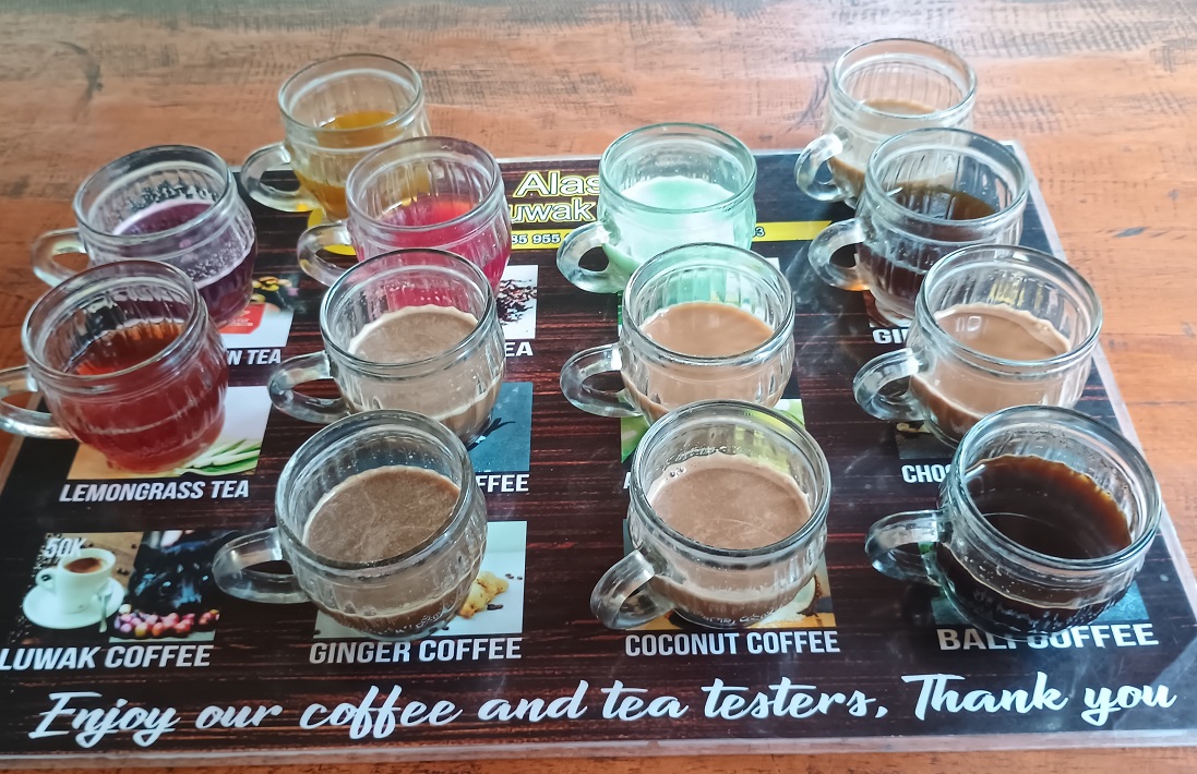 ಆಮೇಲೆ ಪಕ್ಕದಲ್ಲಿ ಇದ್ದ ತೆರೆದ ಹಾಲ್ ನಲ್ಲಿ ನಮ್ಮನ್ನು ಕುಳ್ಳಿರಿಸಿ, ಅಲ್ಲಿ ತಯಾರಿಸಲಾಗುವ ಮ್ಯಾಂಗೋಸ್ಟೀನ್ ಚಹಾ , ದಾಸವಾಳದ ಚಹಾ, ಶುಂಠಿ ಚಹಾ, ವೆನಿಲಾ ಚಹಾ, ಪಂದನ್ ಎಲೆಯ ಚಹಾ, ಲೆಮನ್ ಗ್ರಾಸ್ ಚಹಾ, ಅವಕಾಡೋ ಕಾಫಿ, ಚಾಕಲೇಟ್ ಕಾಫಿ, ತೆಂಗಿನಹಾಲಿನ ಕಾಫಿ, ಶುಂಠಿ ಕಾಫಿ, ಬಾಲಿ ಕಾಫಿ ಮತ್ತು ಲುವಾಕ್ ಕಾಫಿ ಹೀಗೆ ಹನ್ನೆರಡು ಪೇಯಗಳ ಬಗ್ಗೆ ವಿವರಿಸಿ, ಚೆಂದದ ಪಟ್ಟಿಯನ್ನು ಮೇಜಿನಲ್ಲಿ ಇರಿಸಿದಳು. ಇನ್ನೊಬ್ಬಾಕೆ ಹಲವಾರು ಬಗೆ ಕಾಫಿ/ಚಹಾಗಳನ್ನು ತಯಾರಿಸಿ ಆಯಾ ಪೇಯದ ಚಿತ್ರದ ಮೇಲೆ ಇರಿಸಿ, ನಾವು ರುಚಿ ನೋಡಬಹುದೆಂದಳು. ಲುವಾಕ್ ಕಾಫಿ ಇಲ್ಲ ತಾನೇ ಎಂದು ಪುನ: ಕೇಳಿ ದೃಢೀಕರಿಸಿಕೊಂಡು, ಚಮಚ ಕೇಳಿ ಪಡೆದುಕೊಂಡು, ಅಲ್ಲಿ ಕೊಡಲಾದ ಬಣ್ಣ ಬಣ್ಣದ ಚಹಾ/ಕಾಫಿಗಳ ರುಚಿನೋಡಿದೆವು .