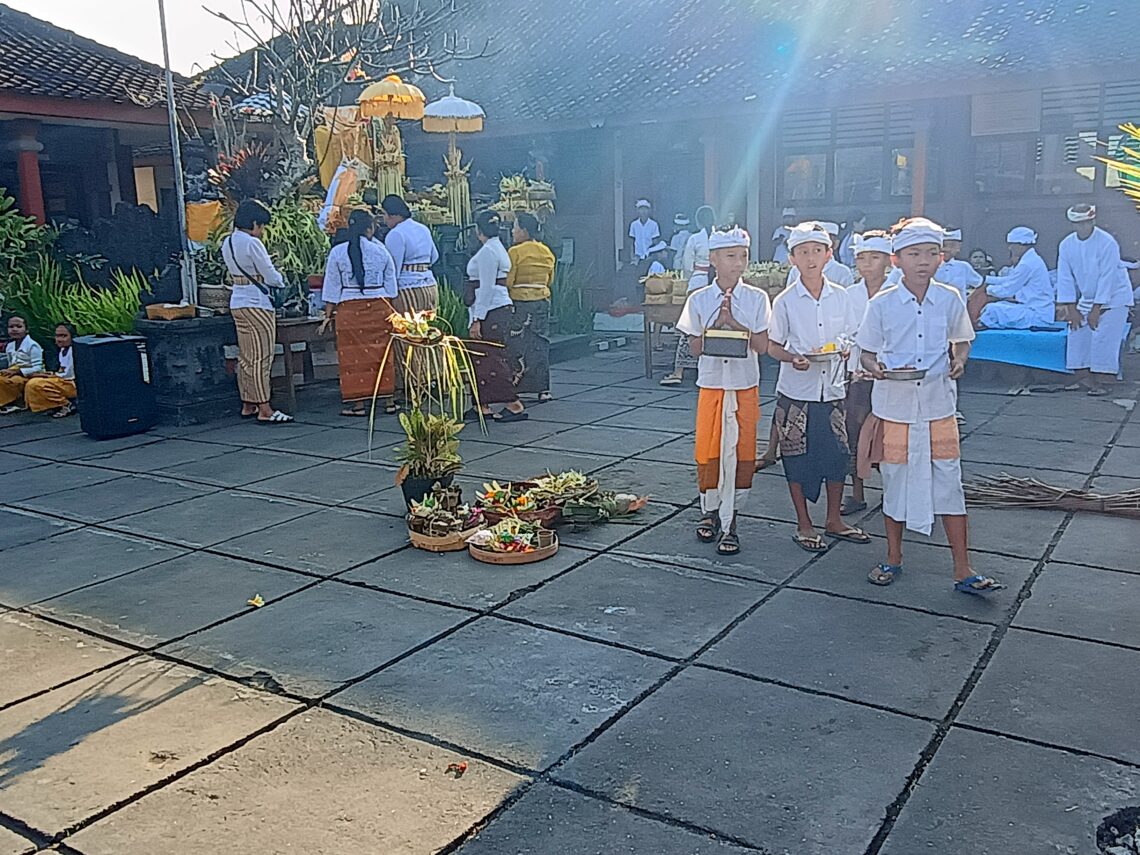 ‘ಸಾರಂಗೊ’ ತೊಟ್ಟು ಅತ್ತಿತ್ತ ಓಡಾಡುತ್ತಿದ್ದ ಪುಟ್ಟ ಮಕ್ಕಳು ಮುದ್ದಾಗಿ ಕಾಣಿಸುತ್ತಿದ್ದರು. ನಾವು ಮಾತನಾಡಿಸಿದರೆ ‘ಓಂ ಸ್ವಸ್ತ್ಯಸ್ತು’ ಎಂದು ಕೈಮುಗಿಯುತ್ತಿದ್ದರು. ಬಾಲಿಯಲ್ಲಿ ಹಿಂದೂಗಳಲ್ಲದವರು 20 % ಜನ ಇದ್ದರೂ, ಶಾಲಾ ಮಕ್ಕಳ ಉಡುಪಿನ ಆಧಾರದಲ್ಲಿ ‘ಬಾಲಿನೀಸ್ ಹಿಂದೂ’ ಅಲ್ಲದವರು ಯಾರೆಂದು ಗೊತ್ತಾಗುತ್ತಿರಲಿಲ್ಲ. ಎಲ್ಲರೂ ಪೂಜೆಯಲ್ಲಿ ಭಾಗವಹಿಸುತ್ತಾರೆ. ಎಲ್ಲಾ ಮಕ್ಕಳೂ ಬಿಳಿ ಡ್ರೆಸ್ ಧರಿಸಿ ‘ಸಾರಂಗೊ’ ಉಟ್ಟಿದ್ದರು. ಅಧ್ಯಾಪಕರ ನಿರ್ದೇಶನದಂತೆ ಒಂದೆಡೆ ಸಾಲಾಗಿ ಕುಳಿತರು. ಪೂಜೆಯ ಆರಂಭಿಕ ಹಂತವಾಗಿ ಕೆಲವು ಅಧ್ಯಾಪಕಿಯರು ಆವರಣ ಹಾಗೂ ಶಾಲಾ ಆಫೀಸು, ಕ್ಲಾಸ್ ರೂಮ್ , ಕುಳಿತಿದ್ದವರ ಮೇಲೆ ಹೀಗೆ ಎಲ್ಲೆಡೆ ನೀರನ್ನು ಪ್ರೋಕ್ಷಿಸುತ್ತಾ ‘ಶುದ್ಧೀಕರಣ’ ಶಾಸ್ತ್ರ ನೆರವೇರಿಸಿದರು. ಇನ್ನು ಕೆಲವರು ಗೇಟಿನ ಹೊರಗಡೆಯೂ ಹೂವುಗಳನ್ನಿರಿಸಿ , ಅಗರಬತ್ತಿ ಉರಿಸಿ ಬಂದರು. ಎಲ್ಲಾ ವಿಗ್ರಹಗಳಿಗೂ ಆಗರಬತ್ತಿ ಉರಿಸಿ ಆರತಿಯಂತೆ ಬೆಳಗಿದರು. ಅಧ್ಯಾಪಕರೂ, ವಿದ್ಯಾರ್ಥಿಗಳೂ ರಾಗವಾಗಿ ಭಜನೆಯ ಮಾದರಿಯಲ್ಲಿ ಸುಶ್ರ್ಯಾವ್ಯವಾಗಿ ಹಾಡತೊಡಗಿದರು. ಹೀಗೆ ಒಂದೆಡೆ ದೇವತಾರಾಧನೆ ನಡೆಯಿತು.